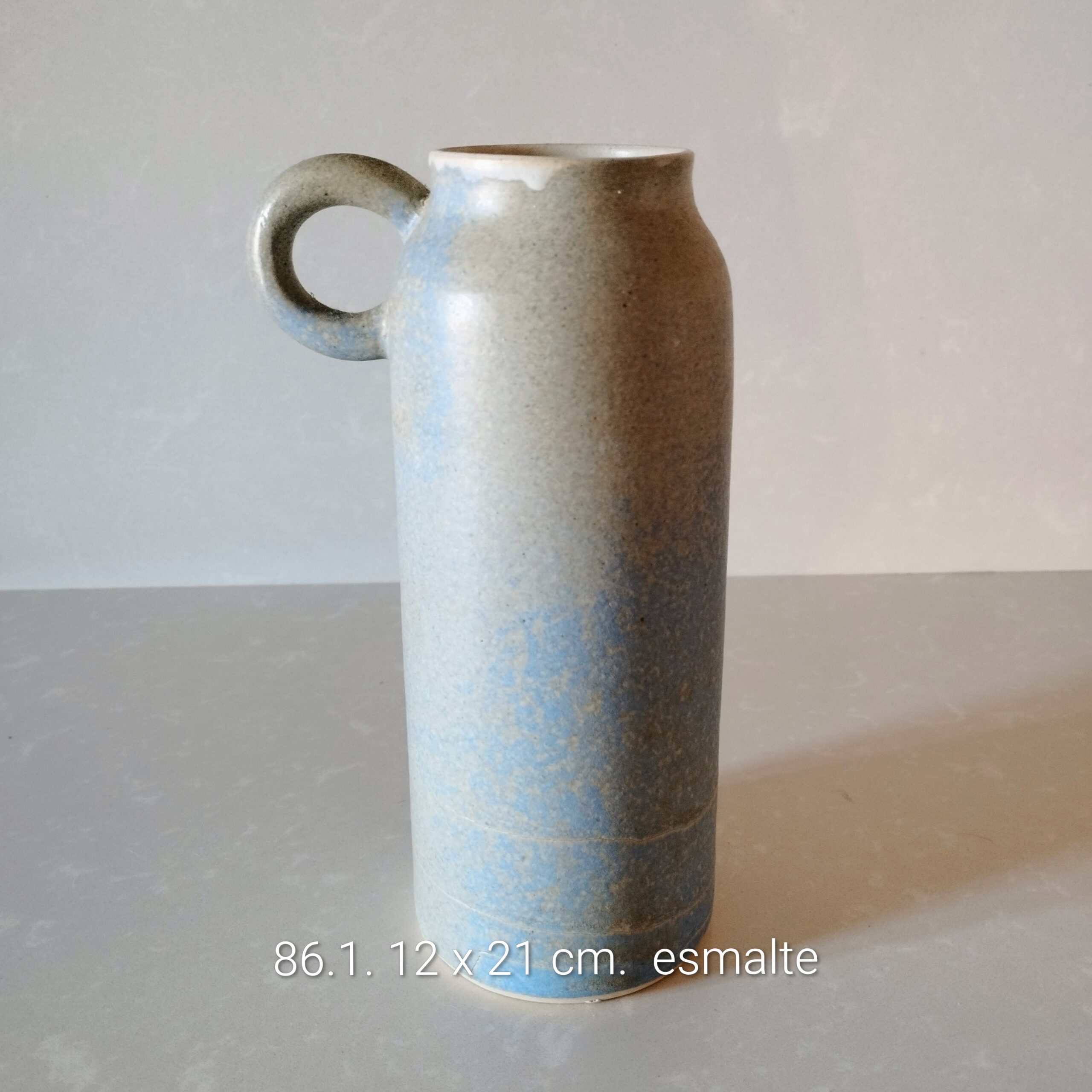 Botella, esmaltado exterior azul verdoso moteado, interior blanco. Funcional